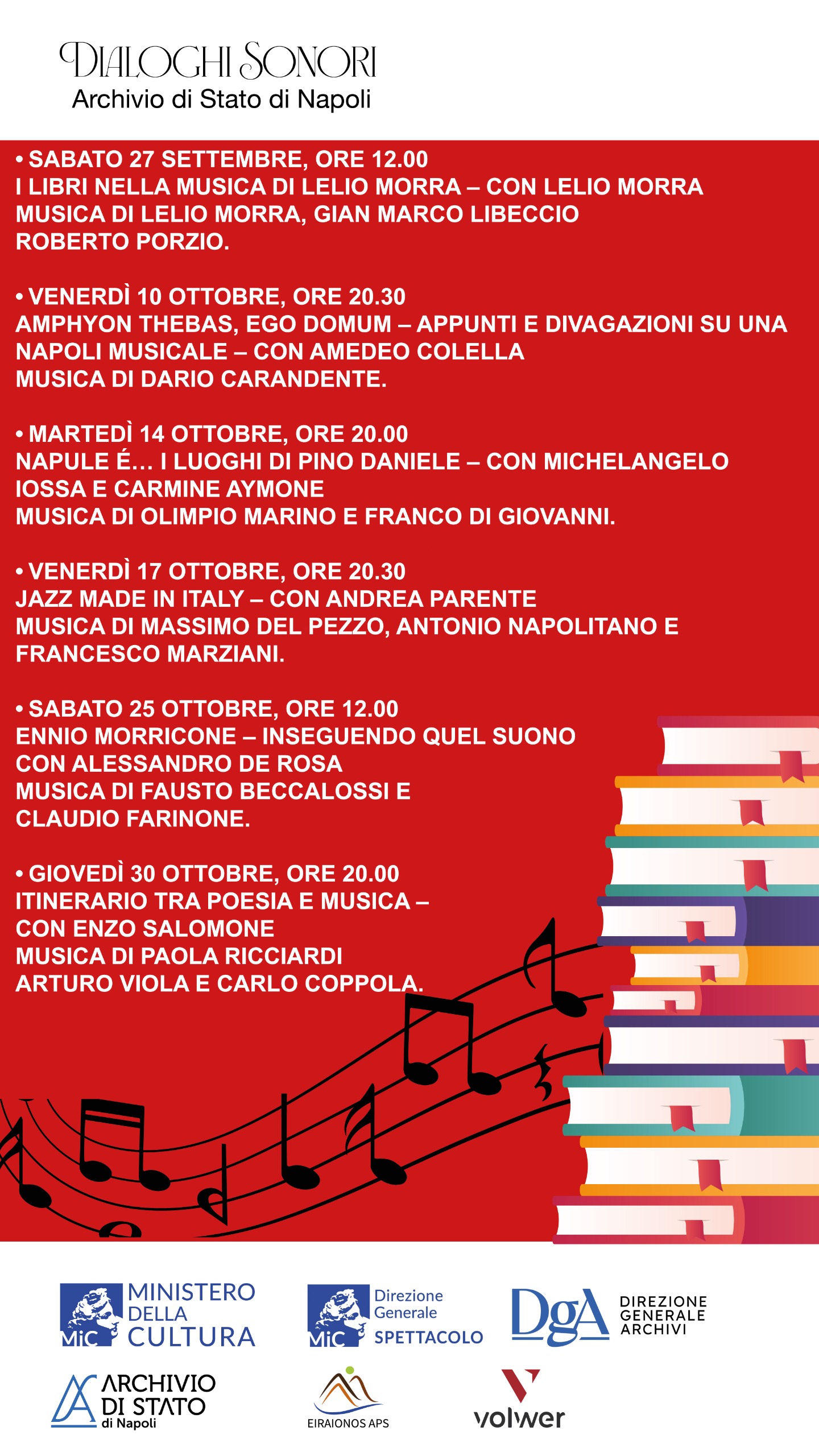 Fino al 30 ottobre 2025, all’Archivio di Stato di Napoli si terrà la rassegna gratuita “Dialoghi Sonori – Libri e Musica in Archivio” che propone sei incontri ad ingresso libero tra libri e musica nello stupendo Archivio di Stato di Napoli.