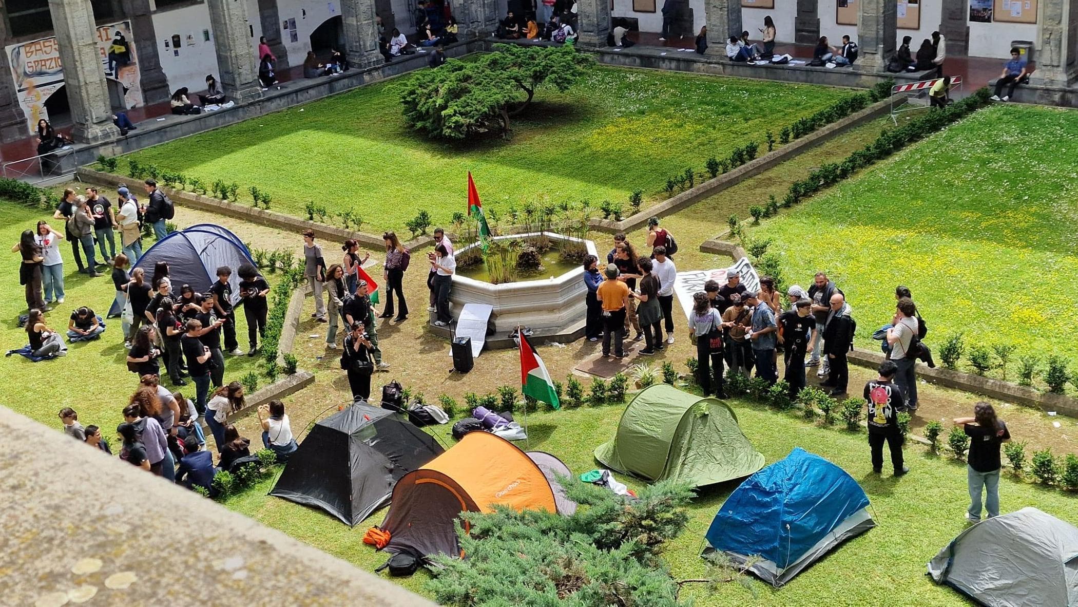 Alcuni attivisti pro Palestina hanno sistemato delle tende da campeggio allestendo un accampamento nel cortile della sede di Porta di Massa dell’Università degli studi di Napoli Federico II.
